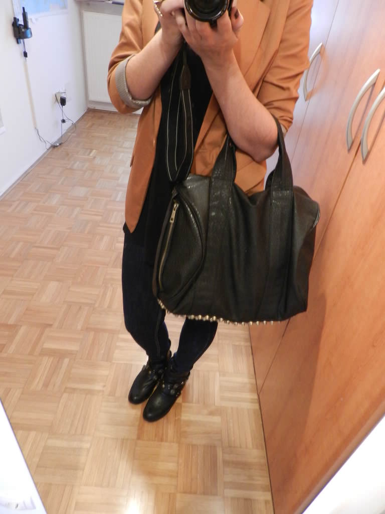 I finally remembered and quickly snapped few photos before classes, of my not very interesting outfit, with my very new bag and ankle boots. Both ordered on internet, boots on Nelly.com and bag on Ebay (no it’s not original Alexander Wang unfortunately, but close enough for me!).