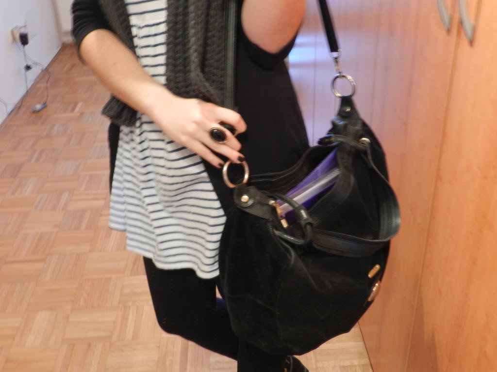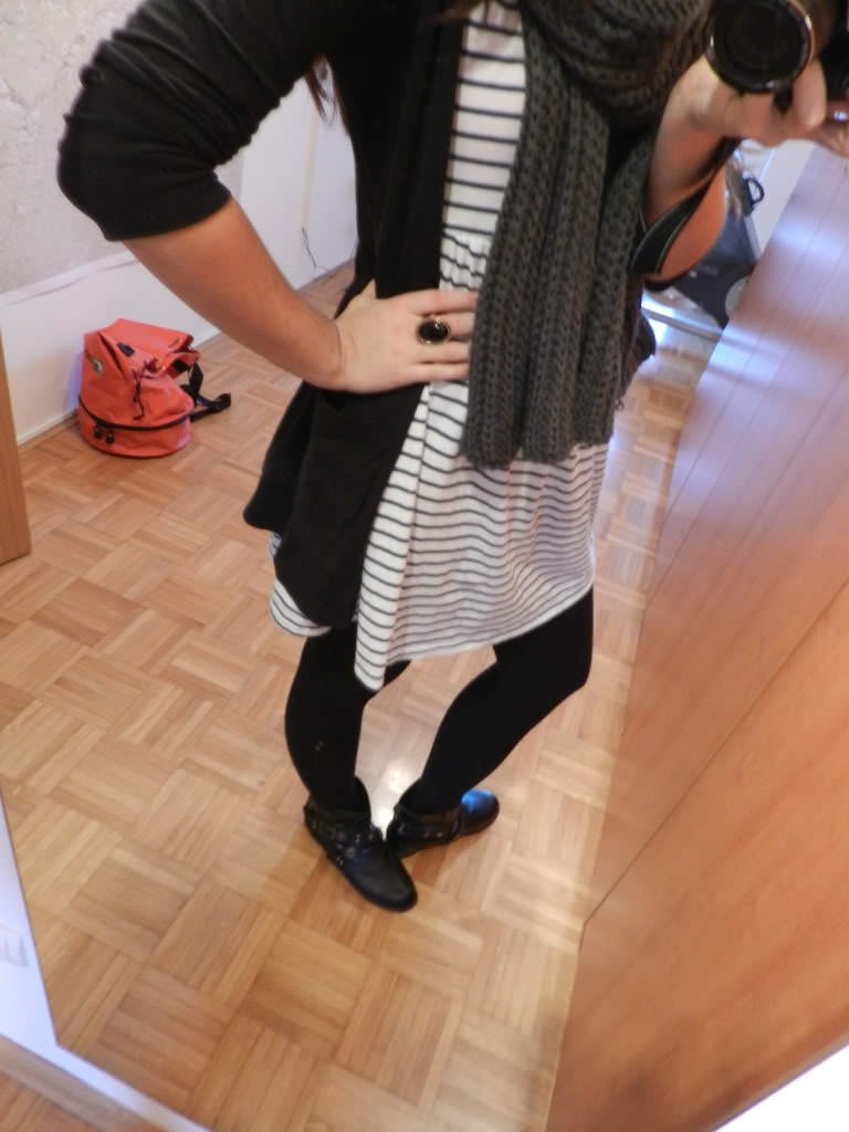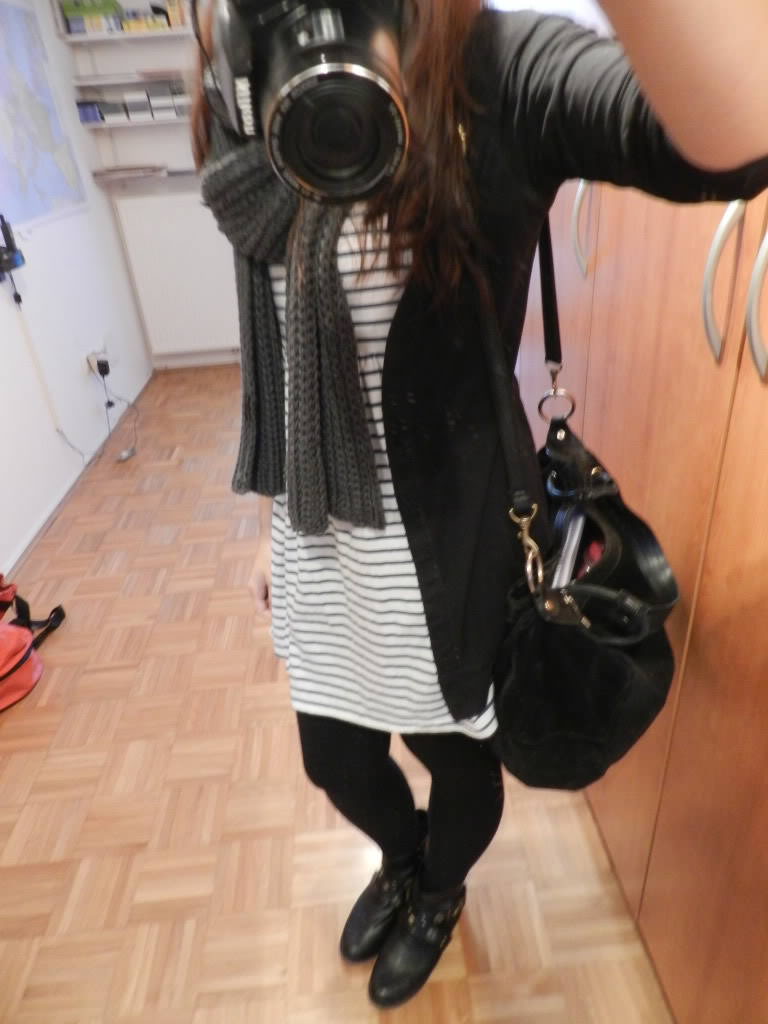 Dress – Topshop, Leggings, Cardigan, Ring, Scarf – H&M, Bag – vintage, Boots – Nelly