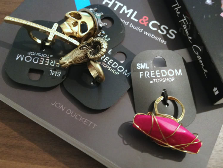 My unresponsible blogging behaviour aside, lately, I’ve been rediscovering Ebay and bidding on pretty much everything. The first package came in just this morning. I won on a bid for these pretty awesome rings from Topshop. And that’s not all. Since I’ve been on a role with online shopping, I also ordered some new books. The Fame Game by Lauren Conrad and a manual for HTML&CSS.