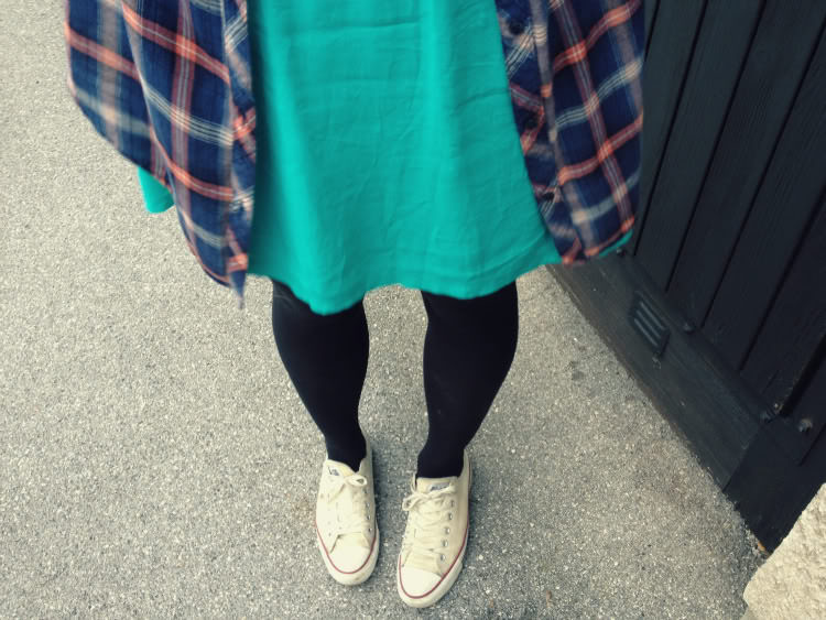 Dress – Bershka, Tights, Shirt, Coat – H&M, Sneakers – Converse, Ring – Topshop