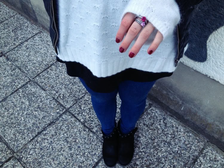 Friday was a day for school and that meant comfy and cozy outfit! So I pulled out long abandoned jeans and added my new pretty sweater with the this year’s favorite ankle booties. Pretty basic stuff actually… And lately I’ve been kinda into the simple pieces that are easily incorporated into several outfits. Don’t know why but the dark red nails are my favorite this fall and winter, I love how they’re settle, but at the same time they still add that dramatic effect to the whole look. All in all, I love this look and will definitely become my regular in this cold days!