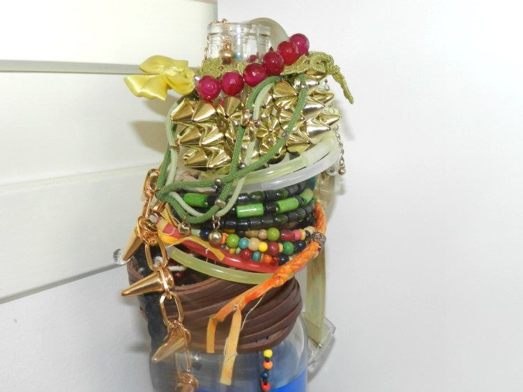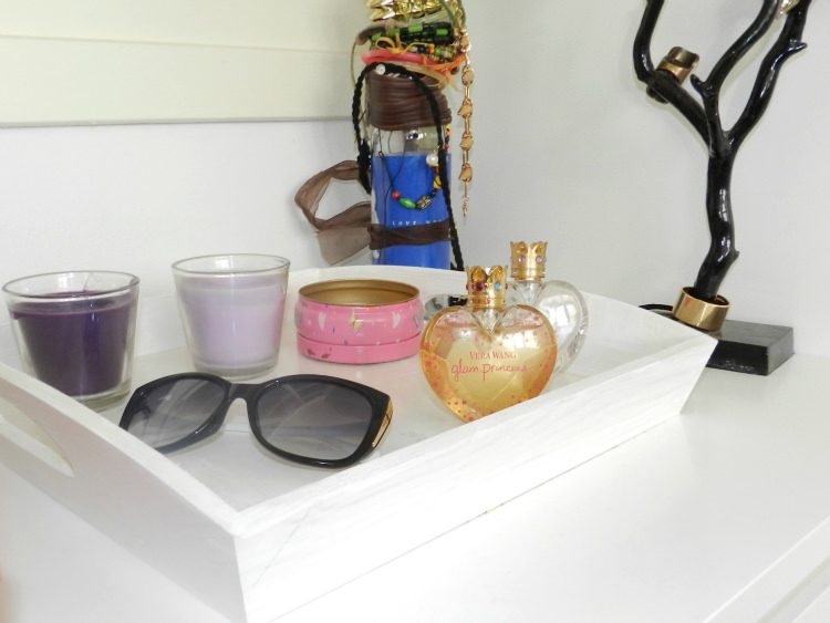 This is another bit of my apartment that got finished few days ago. It took a while, but the top of my drawer is now complete. Picked this tray in a craft store and painted it white and filled it my Princesses, candles and sunglasses. And at the back, I arranged my jewelry, rings on a tree and bracelets on a vine bottle. Also just got some wallpaper so the wall of the closet next to it won’t be so boring. I just love how it all turned out!